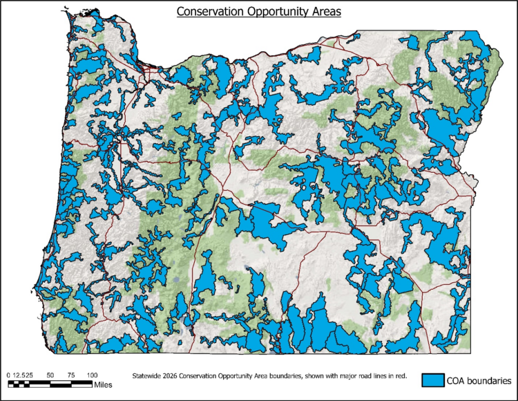 COAs were developed to guide where to implement voluntary conservation actions in Oregon. Land use or other activities within these areas will not be subject to any new regulations. The Oregon Department of Fish and Wildlife (ODFW) COA map, dataset, and other information should only be used in ways consistent with these intentions.
