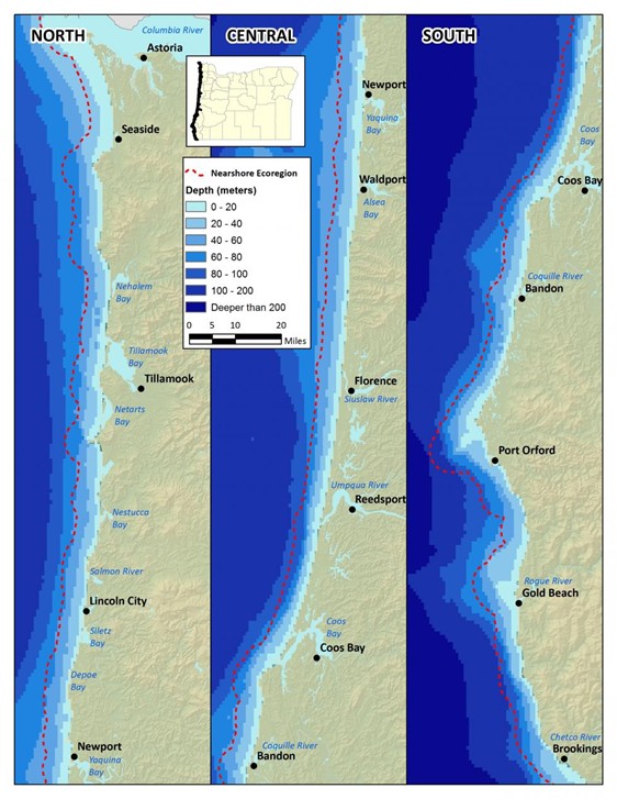 The Nearshore ecoregion encompasses the area from the outer boundary of Oregon’s Territorial Sea at 3 nautical miles to the supratidal zone affected by wave spray and overwash at extreme high tides on the ocean shoreline, and up into the portions of estuaries where species depend on the saltwater that comes in from the ocean. The Nearshore ecoregion is bordered by the Coast Range Ecoregion on the ocean shores and intersects it in Oregon’s estuaries where the influence of the terrestrial watersheds are strongest (Figure 1). Humans are an important part of the ecology of the Nearshore ecoregion and coastal communities are an integral part of that ecology (see Appendix – Coastal Communities).