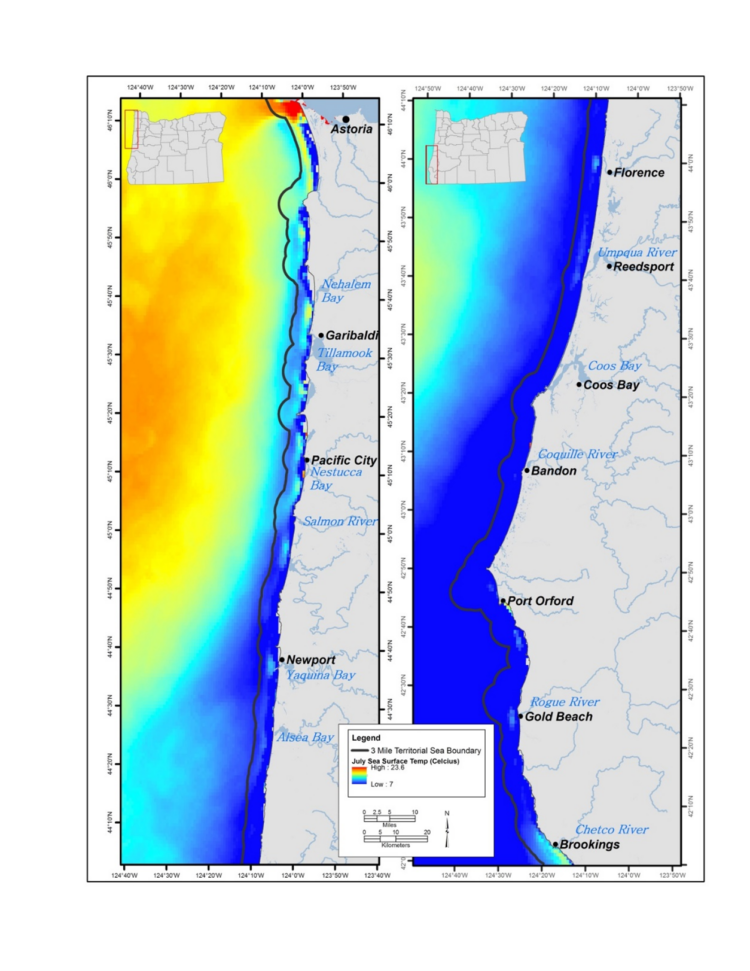 All open water, surf zone, subtidal rocky reefs, sandy beaches, rocky intertidal areas, and estuaries. Ecola Point Marine Conservation Area, Chapman Point Marine Garden, Haystack Rock Marine Gardens Cape Falcon Marine Reserve and West Marine Protected Area, Cape lookout Marine Conservation Area, Tillamook Bay, Netarts Bay, Cape Kiwanda Marine Garden, Fogarty Creek Marine Conservation Area, Boiler Bay Marine Research Area, Cascade Head Marine Reserve and its North, South and West Marine Protected Areas, Pirate Cove Marine Research Area, Whale Cove Marine Conservation Area, Otter Rock Marine Garden, Otter Rock Marine Reserve, Yaquina Head Marine Garden, Yaquina Bay, Yachats Marine Garden, Cape Perpetua Marine Garden, Neptune Marine Research Area, Cape Perpetua Marine Reserve and Marine Protected Areas, Coos Bay, Gregory Point Marine Research Area, Cape Arago Marine Research Area, Cape Blanco Marine Research Area, Redfish Rocks Marine Reserve and Protected Areas, Coquille Point Marine Garden, Harris Beach Marine Garden, Brookings Marine Research Area