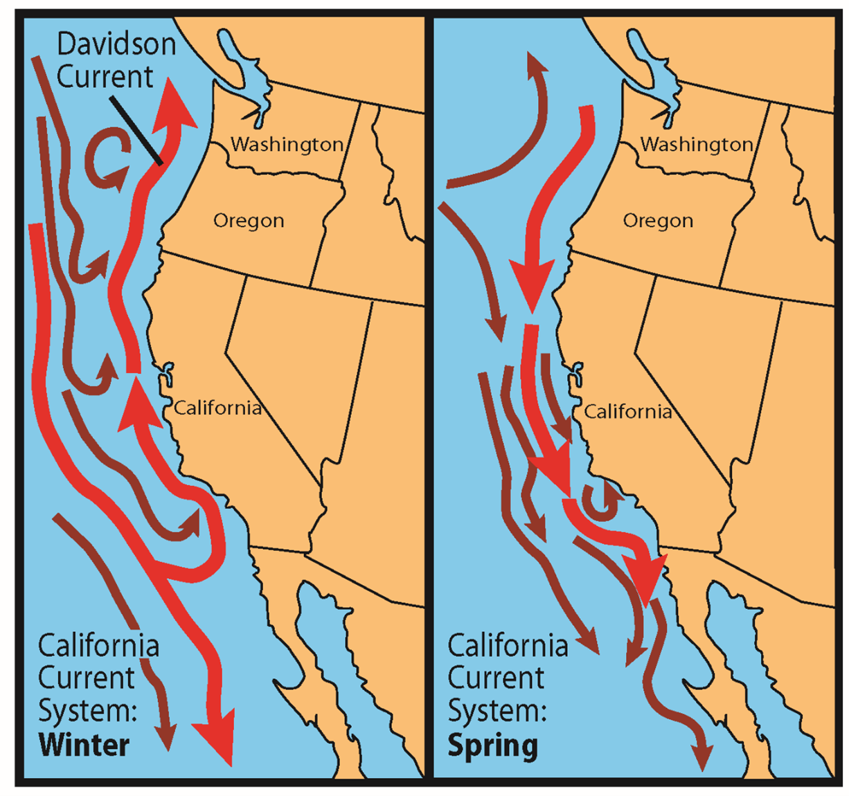 Figure 2. The California Current System typically varies seasonally. (Source P. T. Strub).