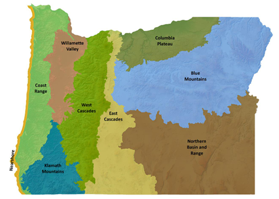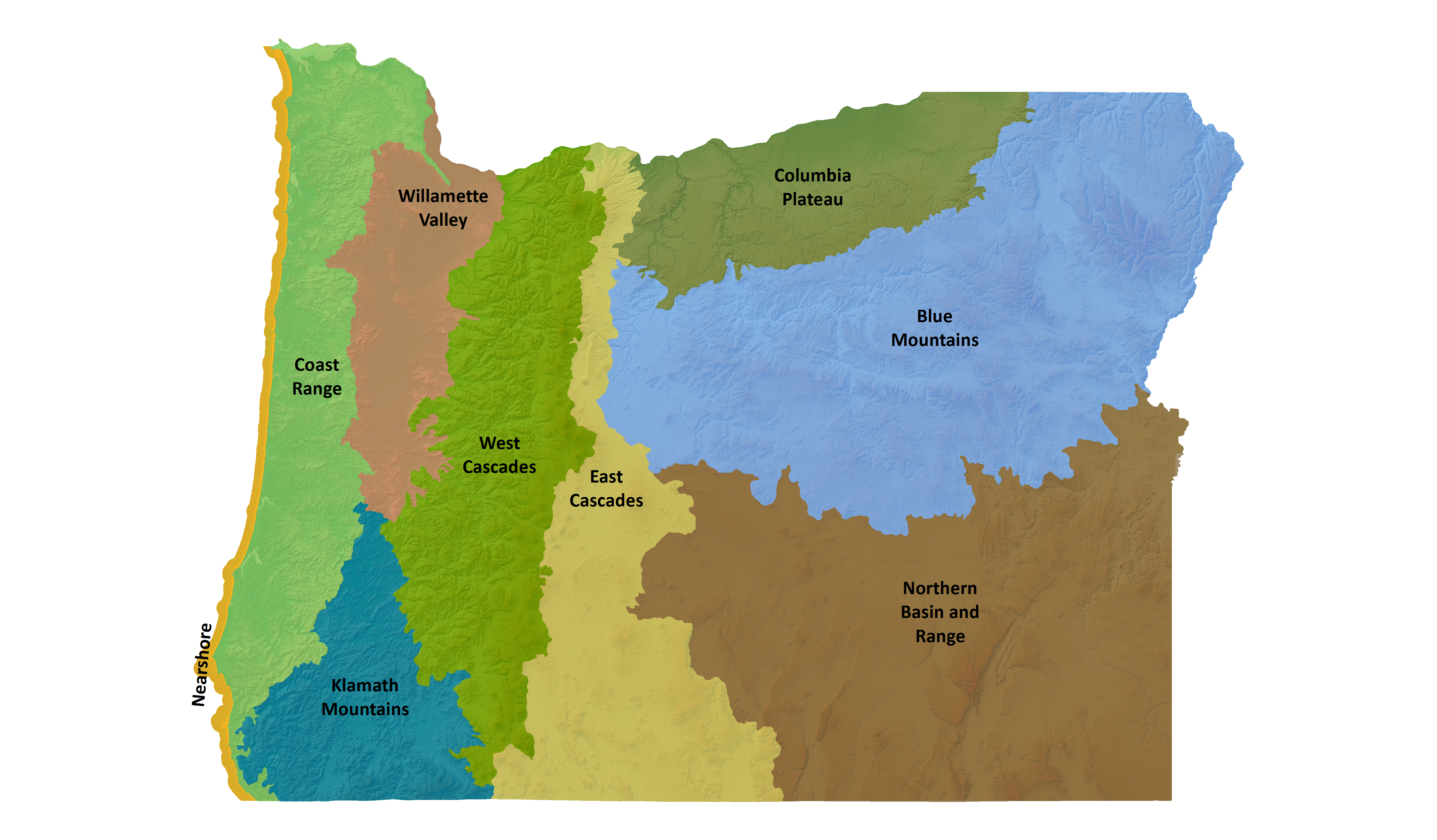 For the inland portion of the state, the State Wildlife Action Plan uses the Environmental Protection Agency’s (EPA) Level III Ecoregions, but combines the Snake River Plain with the Northern Basin and Range. The SWAP designates the Nearshore ecoregion from the outer boundary of Oregon’s Territorial Sea at 3 nautical miles to the supratidal zone affected by wave spray and overwash at extreme high tides on our ocean shoreline, and up into the portions of estuaries where species depend on the saltwater that comes in from the ocean.