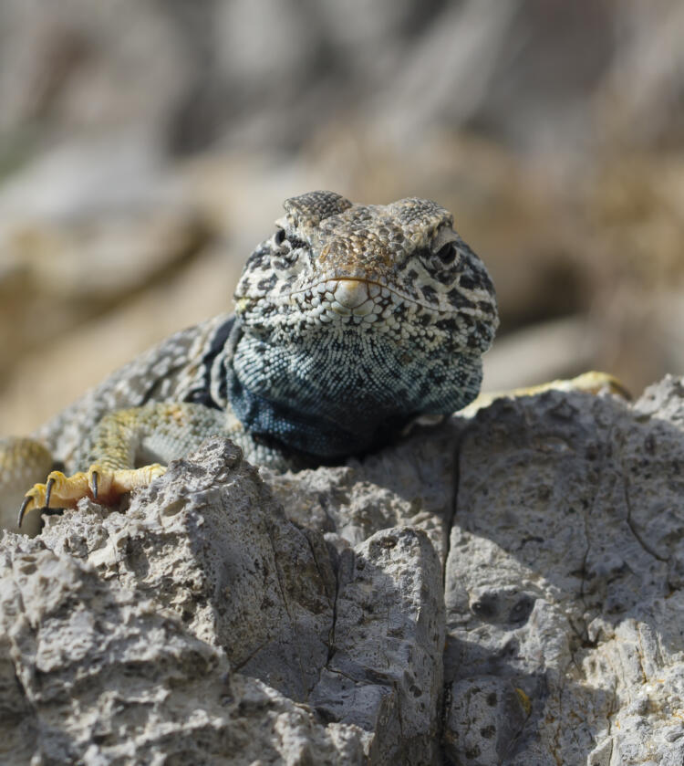 The Great Basin collared lizard is desert-dwelling and occupies sparsely vegetated areas, rocky areas on hillsides, rocky plains with scattered boulders, and canyons.