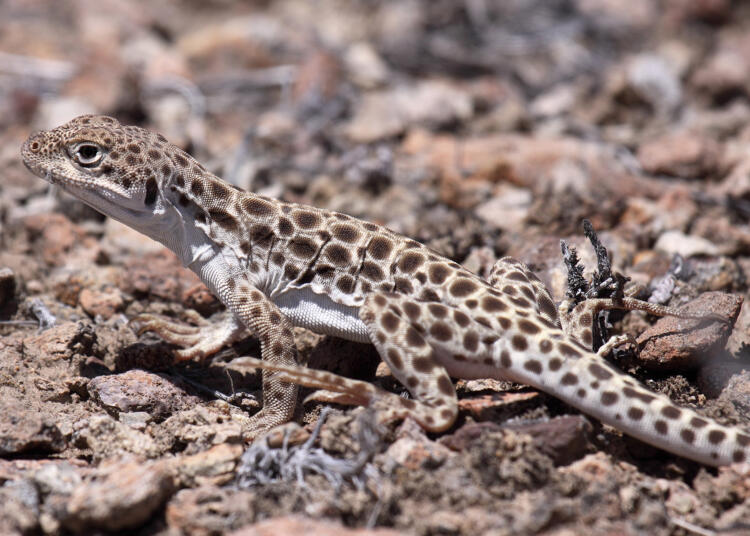 The long-nosed leopard lizard occupies flatland deserts preferring sandy, rocky areas with sparse cover from shrubs. Utilizes mammal burrows for egg-laying.