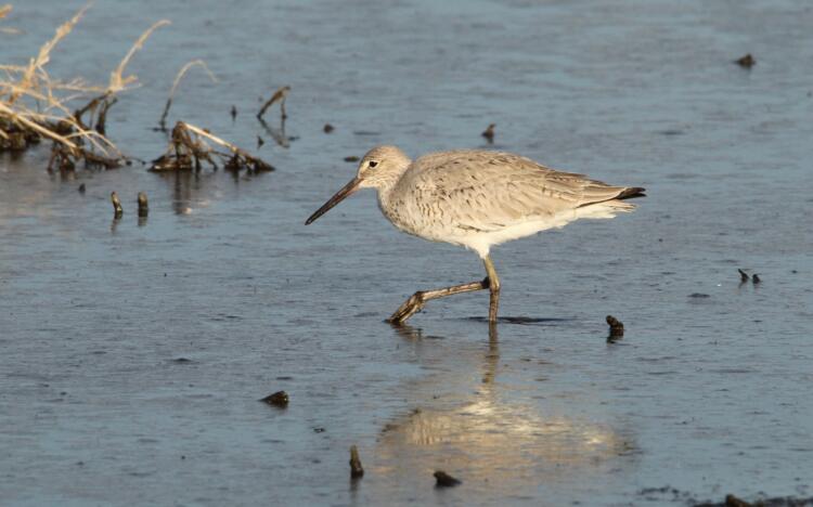 The Willet (Tringa semipalmata) is a large, gray to brownish-gray sandpiper with white lower base of tail and distinctive black-and-white wing stripe pattern. Sexes are similar. Taxonomic split; western population recognized as T. s. inornata (genetic divergence c. 700,000 years ago). Winters on the coast from Mexico to Chile and remain largely separate from the eastern subspecies – with some overlap.