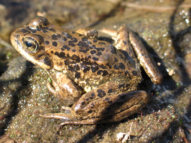 Cascades frogs inhabit mountain meadows, bogs, ponds, or potholes above 2,400 feet elevation. They require access to clean, permanent water sources. Cascades frogs lay eggs in slow-moving water, at shallow, sunny edges of ponds, or on low vegetation near ponds where warm sunlight speeds egg development. Larvae may "school" in large masses.