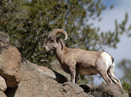 Rocky Mountain bighorn sheep require large expanses of open, rugged canyon grasslands, with numerous rocky outcrops and rock cliffs. Their habitat may include isolated stands of conifer and/or deciduous trees.