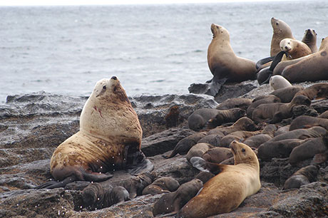 Steller sea lions use haul-out sites on rocks, reefs, or beaches.