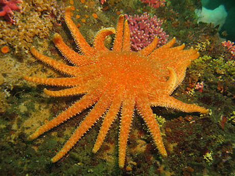 The sunflower star was listed as critically endangered by the International Union for Conservation of Nature (IUCN) on December 10, 2020. An estimated 5.75 billion sunflower stars have died due to sea star wasting syndrome with the global decline in population calculated to be 90.6%. The assessment is based on 61,000 surveys from 31 datasets throughout its range that stretches from Alaska to Baja California, Mexico. ODFW contributed to the data used in the analyses. These data do not show any signs of recovery in any region since the outbreak of the disease began. The sunflower star is nearly absent in the marine waters off the west coast of North America with the few exceptions being in the Salish Sea, British Columbia, Alaska, and a handful of sightings off the coasts of Oregon and Washington. The sunflower star is a key predator of sea urchins, whose population have increased dramatically in many regions since the decline in the sunflower stars began. Scientists think that there is little chance of rapid recovery in U.S. water unless there is some form of intervention. Research is getting started to experiment with captive breeding in hopes of eventually being able to reintroduce this keystone species to areas where it is now absent. In August 2021 a petition was filed to list the sunflower star as Threatened or Endangered under the U.S. Endangered Species Act and in December 2021 NOAA Fisheries announced that it found substantial new information presented in the petition and that they are initiating a full review of its status. ODFW along with other researchers are working to provide the types of scientific information directly to NOAA Fisheries that it has asked for its review.